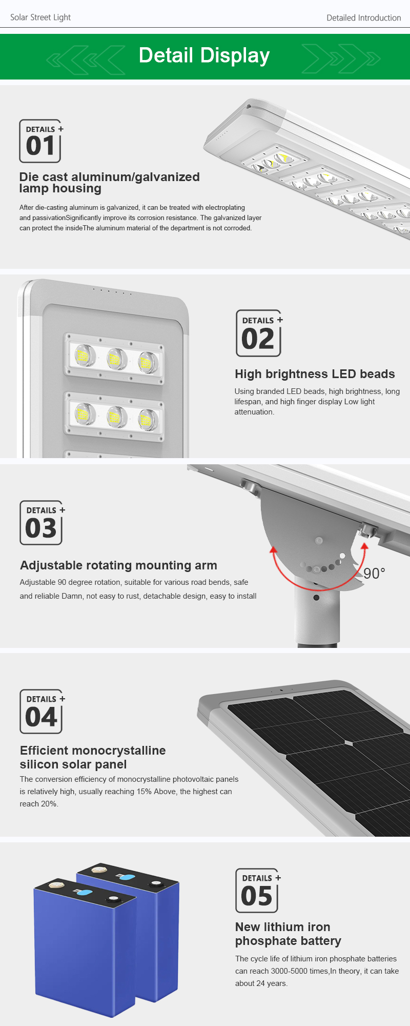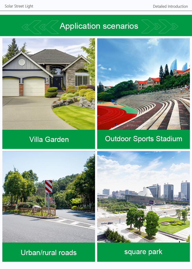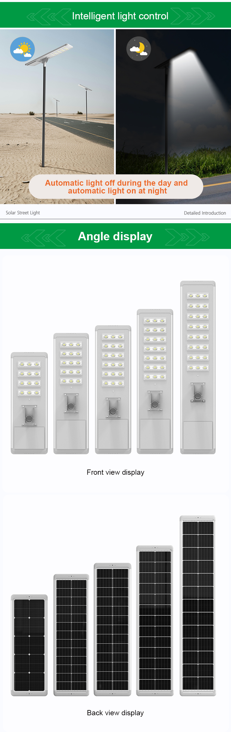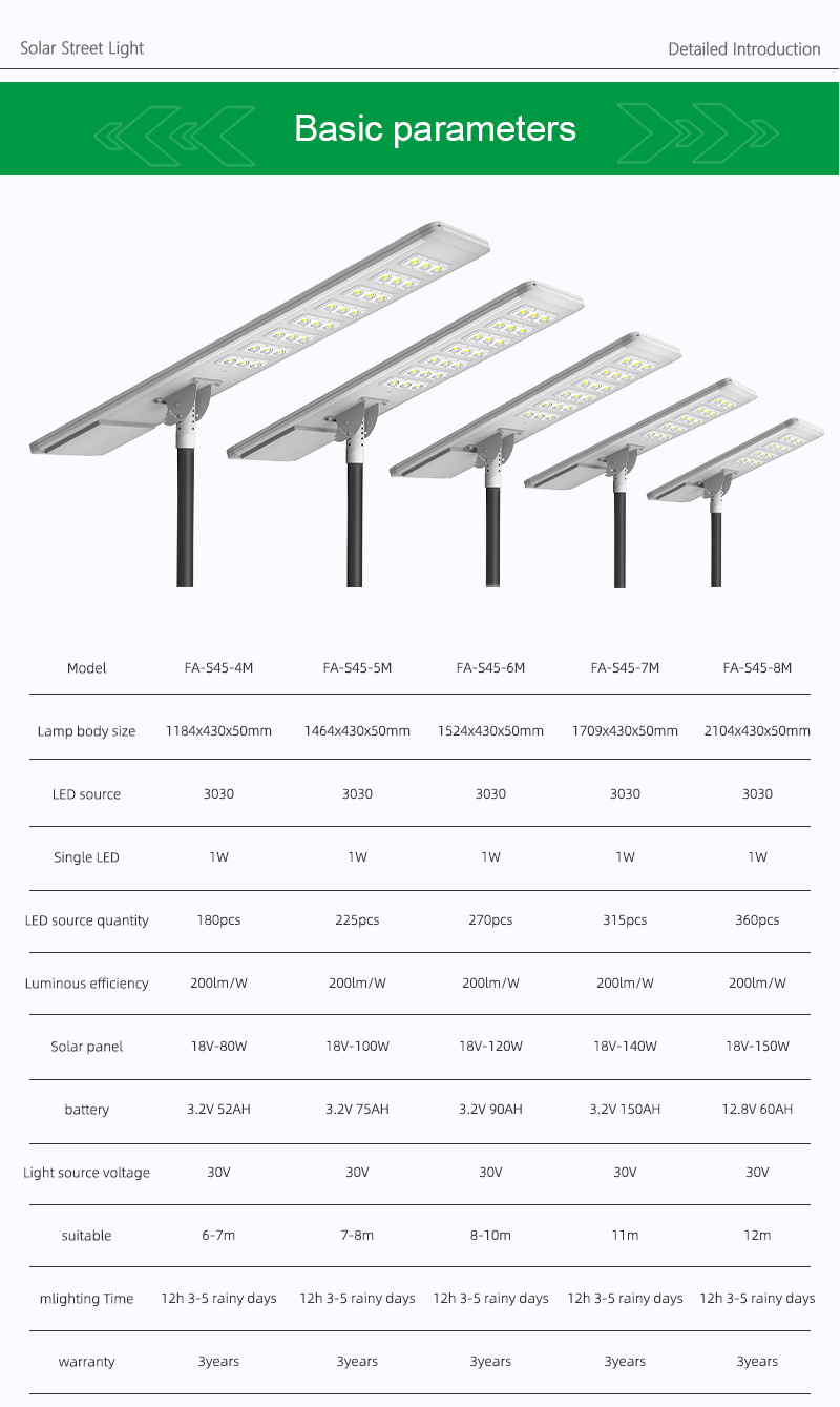 FA-S45 Solar Light is a patented new integrated solar street light with die-casting aluminum housing, designed to provide high-quality external lighting solutions for users. It has passed CE, RoHS and other international certifications, and has the following advantages: no wiring, easy installation, high charging efficiency, long life, and outstanding luminous efficacy.Built-in large-capacity lithium battery provides continuous illumination through the solar panel's high-efficiency conversion and storage of electricity.It is suitable for use in a variety of scenarios such as courtyards, parks, neighborhoods, rural roads, urban myriad roads, and highways, etc. It can satisfy the lighting needs of different environments and provide safe, environmentally friendly green lighting support for outdoor activities.